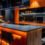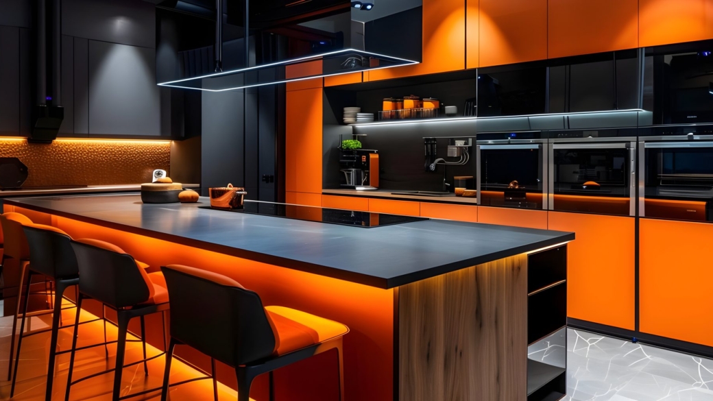LED strip lighting runs discreetly beneath the upper cabinets, providing task lighting and highlighting the materials and textures throughout the space. The combination of integrated technology, hidden functionality, and subtle lighting results in a refined, highly efficient kitchen with a strong architectural presence.